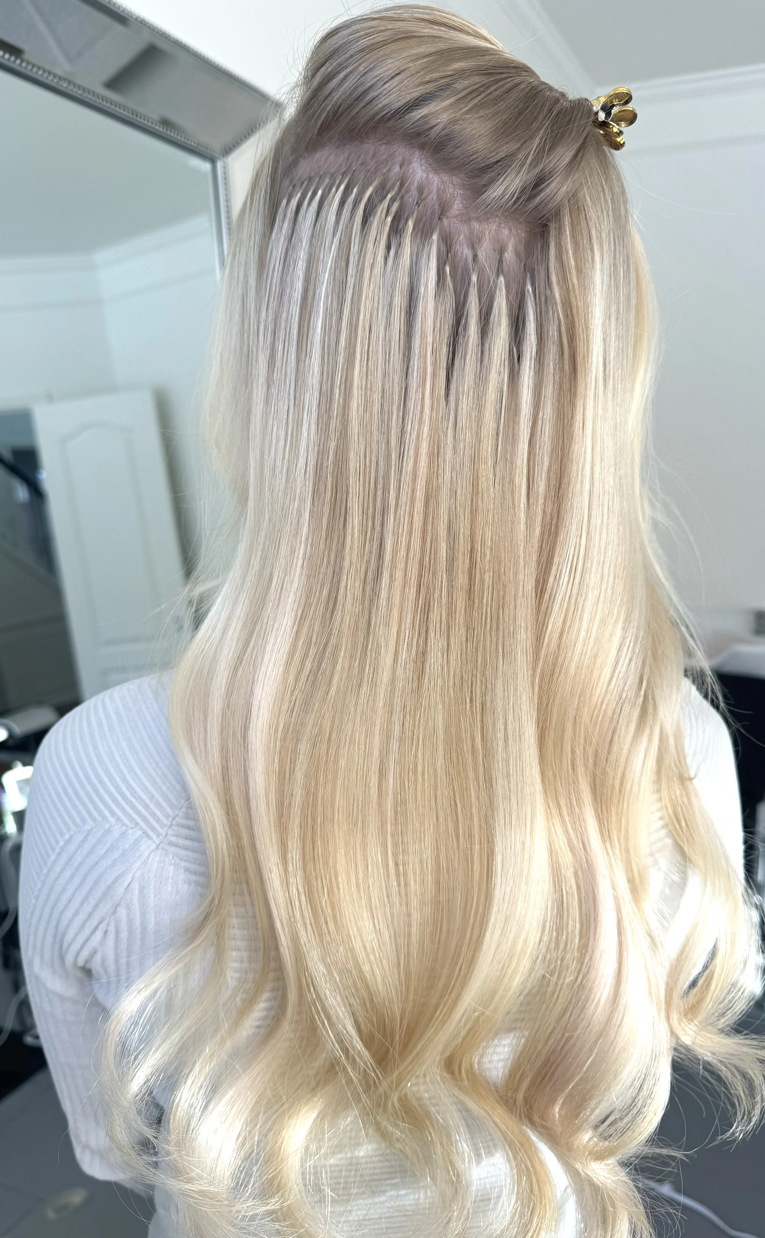 In this transformation, we added volume and length using two packets of extensions. I customized the bond size to suit the texture and density of the client’s natural hair.